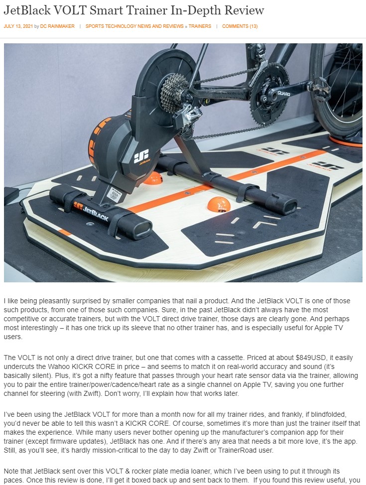„Ich benutze den JetBlack VOLT jetzt seit mehr als einem Monat für alle meine Fahrten mit dem Trainer und ehrlich gesagt, wenn man die Augen verbunden hätte, könnte man nicht sagen, dass es sich nicht um einen KICKR CORE handelt.